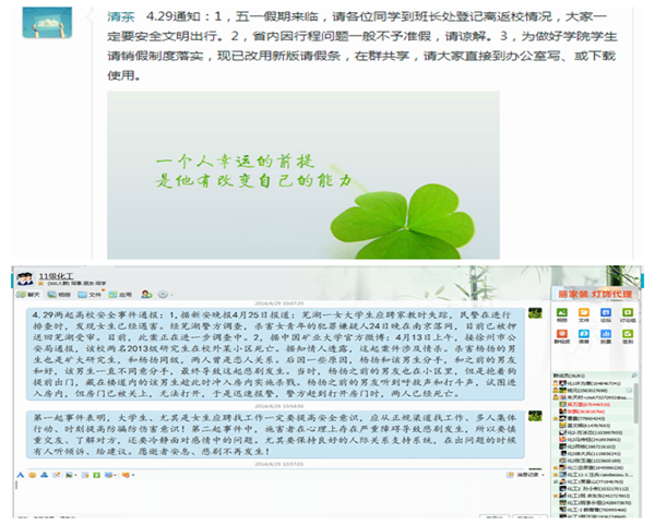 学院安全工作组对春夏季防溺水、春季出行、就业防骗、突发事件、运动安全、宿舍防盗、心理健康、个人卫生等学生中易发安全问题进行了逐一梳理,学院通过主题班会、网络宣传、手机信息、深入核查、当面教育等多种手段,努力做到学生安全教育的多方位、全媒体覆盖。学院辅导员利用QQ、微博、微信、班级云等社交媒体,结合典型学生安全事件案例,教育引导学生安全、愉快过好大学生活,大大提升了传播、教育实效。