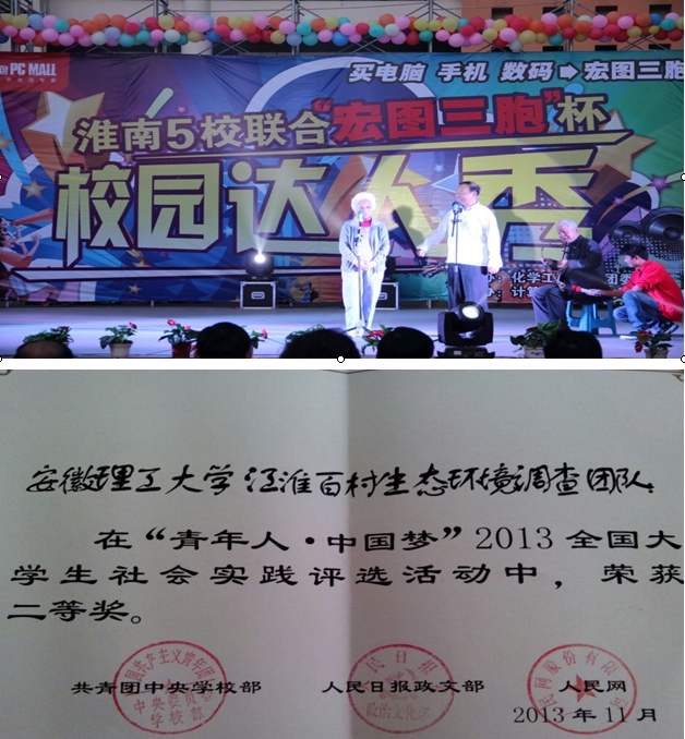 在学校2013年暑期“三下乡”社会实践活动总结考评会中,学院获得“暑期社会实践活动标兵单位”;自拍网 大学生赴小岗村关爱帮扶团、大学生赴阜阳文化服务团、大学生江淮百村生态环境调查团队荣获优秀团队荣誉称号。对于生态环境问题的关注,学院也在打造新的亮点,每年在四六级考试前夕,开展了“资源有限,循环无限”旧电池回收的公益活动,取得了良好的效果。