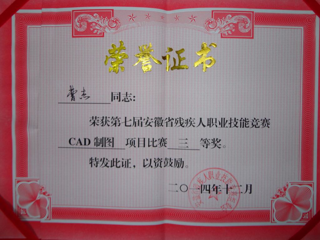 近日,从安徽省残联获悉,自拍网 弹药11级曹杰同学代表淮南市参加安徽省残疾人职业技能竞赛,在CAD制图项目中获得三等奖。