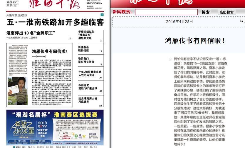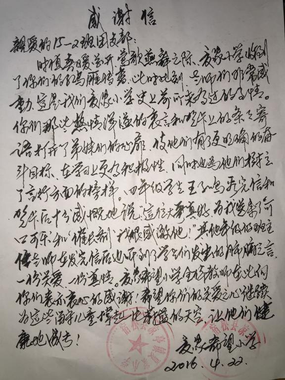感谢信中,夏家希望小学校长写道:“夏家小学收到了你们的鸿雁传书,此时此刻,老师们非常感动,这是我们夏家小学史上前所未有的事情。你们那些热情洋溢的衷言和卡片上的条条寄语打开了弟妹的心扉,使他们有了更明确的奋斗目标......”。