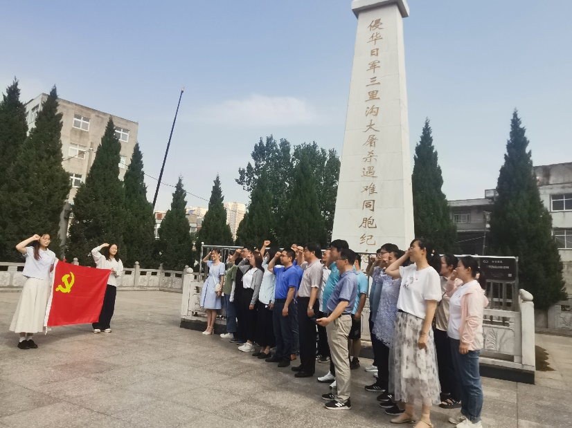 全体党员在支部组织下,到三里沟抗日纪念园悼念遇难同胞。武成利带领大家在纪念碑前重温入党誓词,激励同志们时刻“不忘初心、牢记使命”,报效祖国。他指出,革命先烈们用生命和鲜血换来了今天国家的富强、人民的安居乐业,作为新时代的中共党员,我们要谨记自己的使命,为中华民族的伟大复兴而努力。