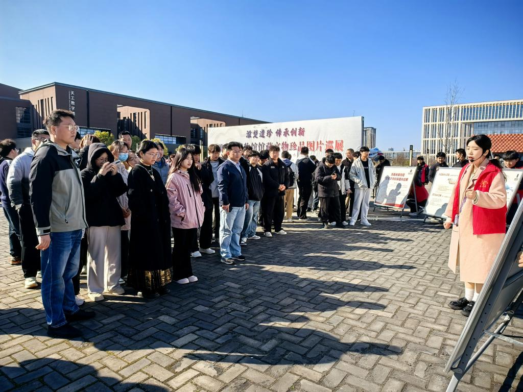 活动现场,一幅幅精美的文物图片整齐排列,涵盖了陶器、瓷器、青铜器等各类珍品,每一件文物都承载着淮南独特的悠久历史和文化底蕴。博物馆讲解员为前来观展的师生进行细致入微的讲解,用生动的话语讲述文物背后的历史故事和文化内涵,将淮南悠久的历史鲜活地呈现在大家面前。