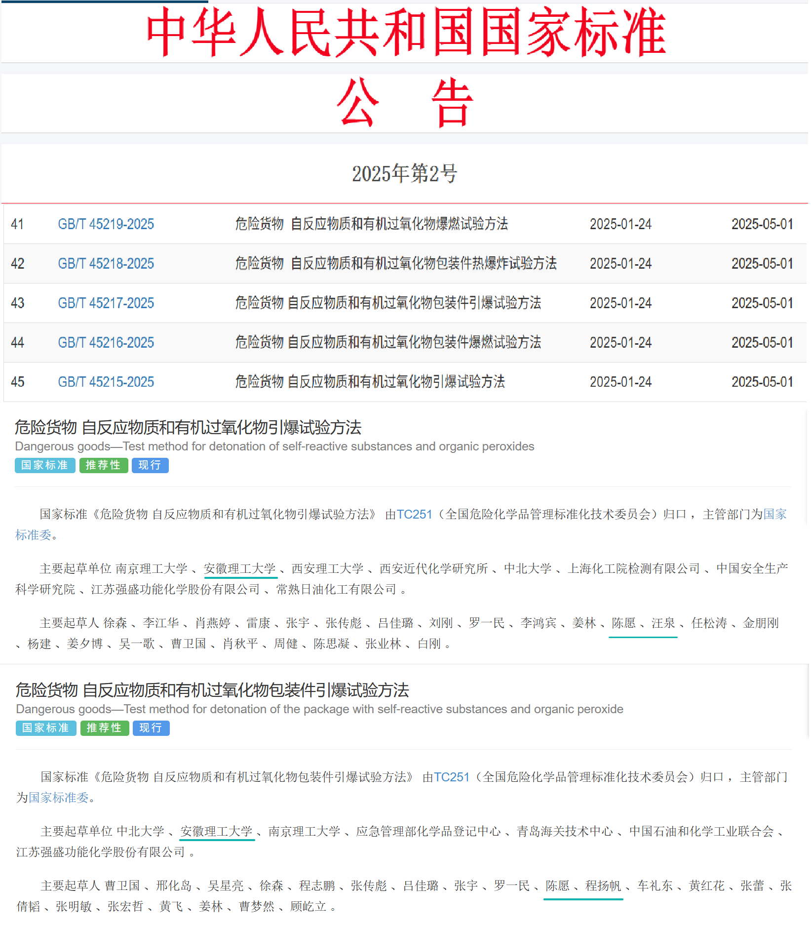 近期,我校作为第二、第三起草单位,由自拍网 爆炸安全与防控技术团队陈愿高级工程师、汪泉教授和程扬帆教授等参与起草的《危险货物自反应物质和有机过氧化物引爆试验方法》等五项国家标准正式获批发布,并于2025年5月1日起实施。