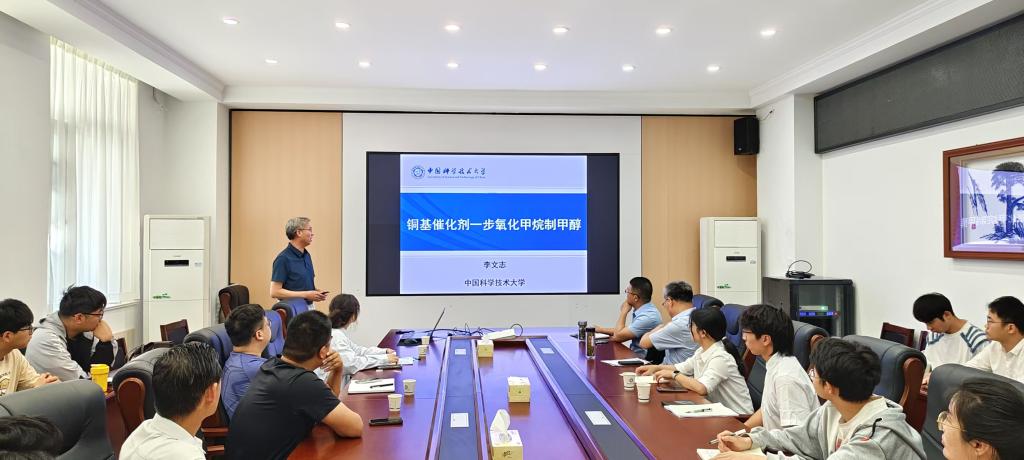 李文志教授在报告中依次介绍了甲烷制甲醇的原理与技术难点、同核和异核铜基双原子催化剂的活性位点设计与路径调控;并指出催化剂在使用直接研磨法的前提下,有机盐前驱体的效果优于非有机盐,半工业化放大试验及循环测试验证了铜基催化剂体系的技术可行性。报告的最后,李文志教授与参会师生就氢气进行绿色甲醇路线的可行性、氯化铜做前驱体的优势和传质压力等问题展开了深入的讨论和交流,对青年教师、研究生如何提出了宝贵的意见和建议。