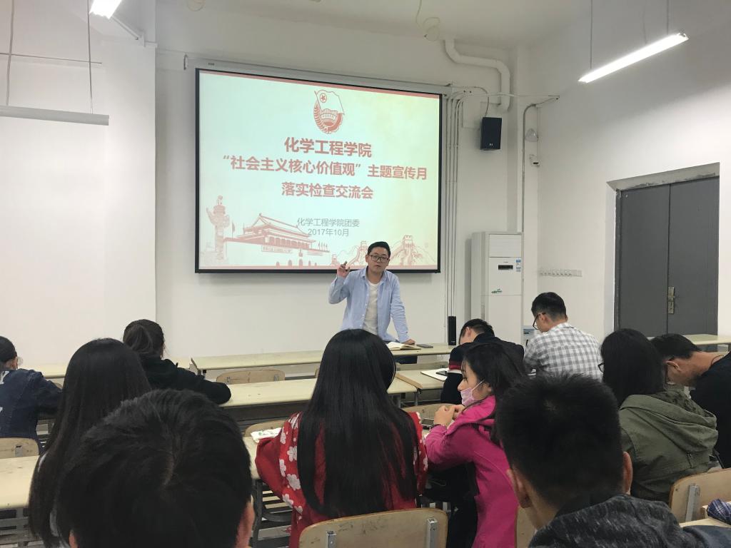 为迎接党的十九大胜利召开,响应校团委关于“践行社会主义核心价值观”的号召,在学生中树立和弘扬社会主义核心价值观,化工学院于10月15日在学院楼102教室开展了“社会主义核心价值观”主题宣传月交流会活动,各年级基层团支部团干共90余人参加了此次交流会。