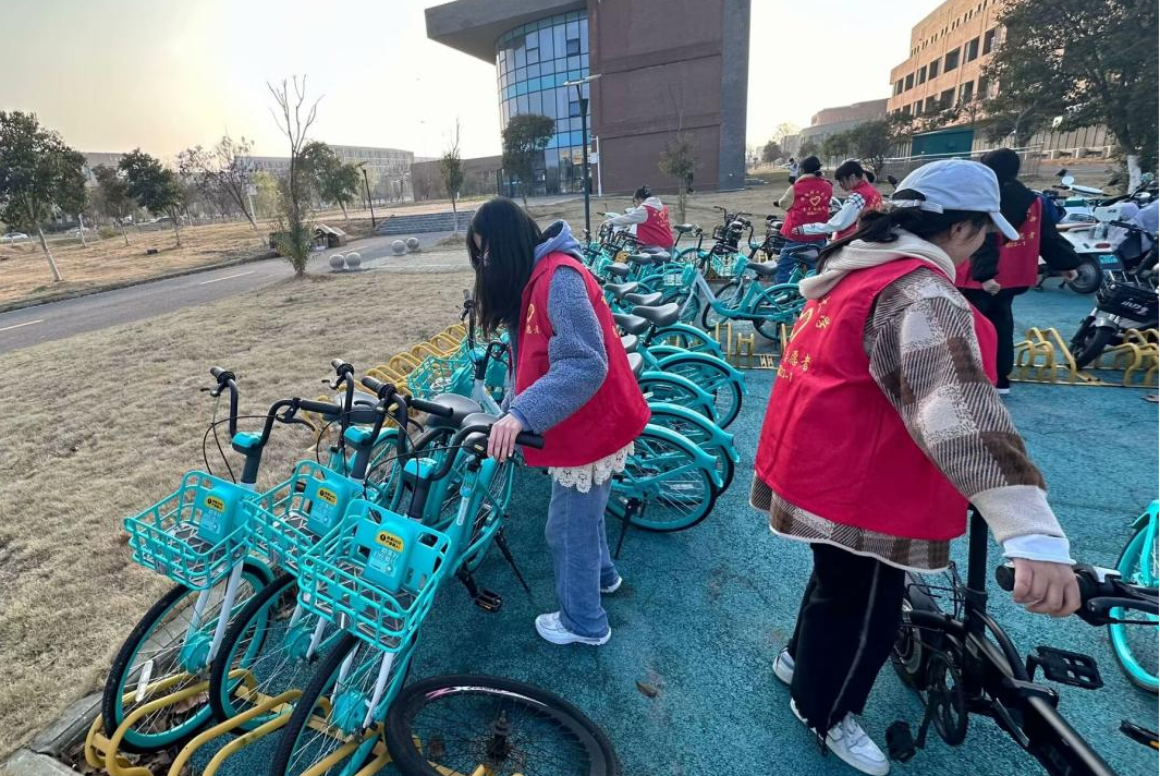 活动过程中,同学们身穿红色志愿者马甲,手持垃圾袋和拾捡工具,穿梭于学院周边的绿荫小道和花丛之中,细心地捡起每一片垃圾。此外,他们还对无序停放的共享单车进行了整理,他们轻轻扶起倾倒的车辆,一辆接一辆地排列整齐。 活动现场,同学们热情高涨,干劲十足。