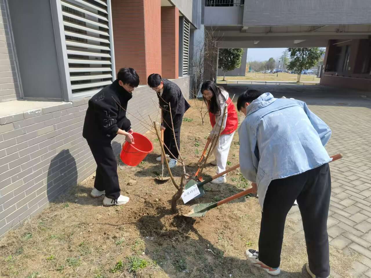 阳光正好,微风不燥。参加志愿服务的同学在各班团支部书记的带领下将提前购置的树苗运送至规划区域。同学们相互协作,亲自动手,挖坑的挖坑,种树的种树,填土的填土,浇水的浇水,每一个树苗的种下,象征着一份绿色的希望,代表着青年学子对学校的奉献与爱心。植树过程中,同学们热情洋溢,乐此不疲,现场气氛热烈,并积极地清理学院周围的垃圾和枯木,用实际行动践行环保理念,弘扬雷锋精神。活动结束后,同学们纷纷在自己种植的树苗前合影留念并写下寄语,“向上生长,向下扎根”、“十年树木,百年树人”,“种下一棵树,收获一份爱”。