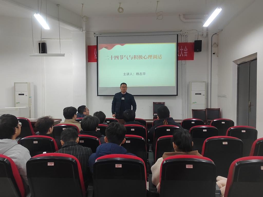 会上,杨志华以“二十四节气与积极心理调适”为主题,向大家介绍了二十四节气的起源、物候现象、研究概况、运用情况和当代价值。他指出,二十四节气对中华民族的宇宙观、自然观产生了深刻的影响,甚至对中华民族的生产方式、社会生活、文化心理也有深刻的影响。随后,他从气候对人类心理、生理及社会功能等各方面的影响入手,强调冬季因其特殊的气候因素,更是成为抑郁等情绪障碍的高发季节,提醒同学们要保持积极的心态,合理控制饮食,寻求社会支持,适量运动,培养兴趣和爱好。