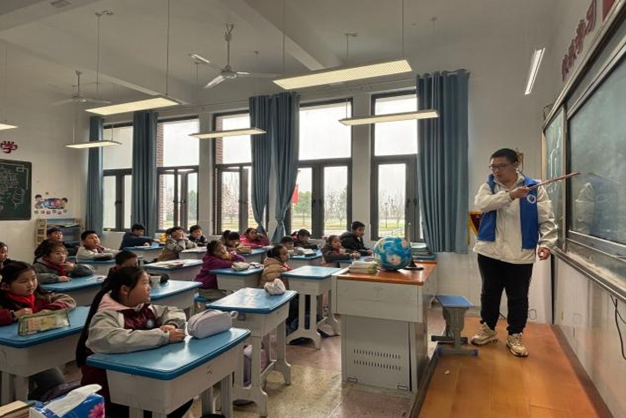第二堂课,志愿者将目光聚焦于气候变化这一热门话题。他们以济南三月暴雪这一特殊气象现象为例,借助气候图与地球仪,生动形象地向孩子们演示了寒潮的形成机制,以及全球气候的基本规律。孩子们沉浸在奇妙的地理知识世界里,收获颇丰。
