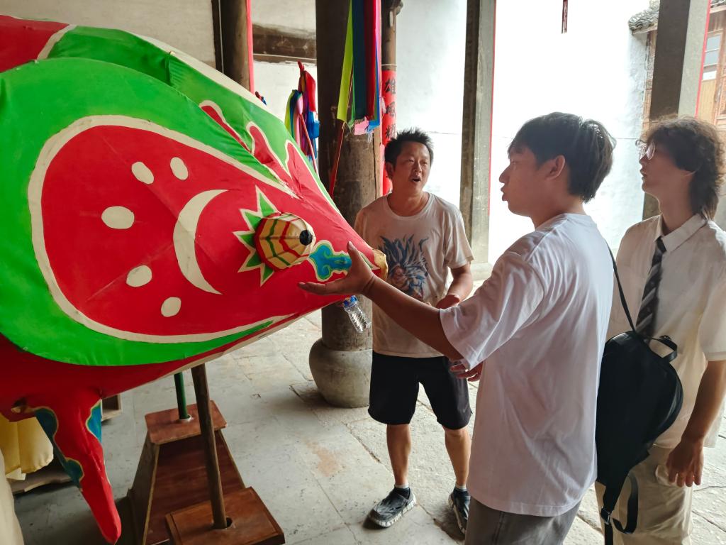 随后实践团队在村书记的带领下走访了瞻淇古村的古建筑群,深入了解瞻淇村的人文历史和鱼灯八百年的传承故事,汪氏祠堂、九世同堂、汪莱故居等古建筑背后传承的文化也独具匠心,无不体现着瞻淇一脉相承的传统文化;傍晚,活动负责人向队员们展示了戏鱼灯中的动作细节,鱼步、斗鱼、如鱼得水、鱼跃龙门等每个动作都流畅优美,将鲤鱼的动作表现得活灵活现。同时队员们也亲身体验戏鱼灯,直观感受到了举起沉重鱼灯的不易和戏鱼灯时的欢乐。