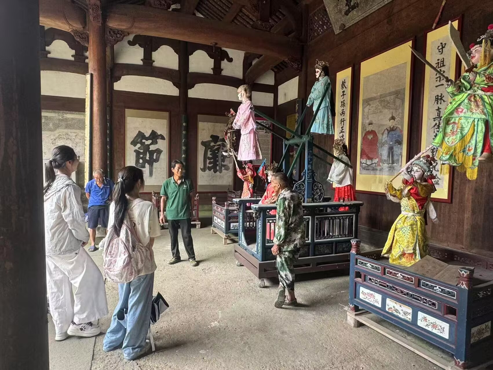 7月22日上午,团队首站抵达绩溪县伏岭镇。在三位花车转阁传承人的带领下,队员们走进古老祠堂,近距离观摩历经修缮的非遗道具模型,聆听传承人细致的讲解。通过互动交流,队员们深刻感受到非遗文化的温度与传承责任。
