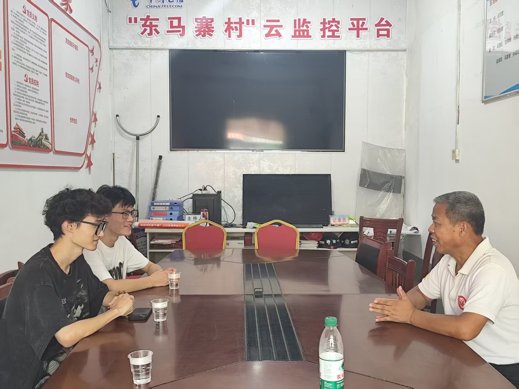 实践团队抵达东马寨村后,首站便来到村委会,与东马寨村村委会主任马万营进行了深入交流。在村委会会议室,马万营向同学们阐述了科学规划对乡村长远发展的决定性意义,特别介绍了污水处理改造项目在改善村居环境、提升生态品质方面取得的成效,强调这是推动可持续发展的关键一步。展望未来,他特别强调了发展乡村文旅的潜力,提出可探索如“共享菜园”等特色体验项目。