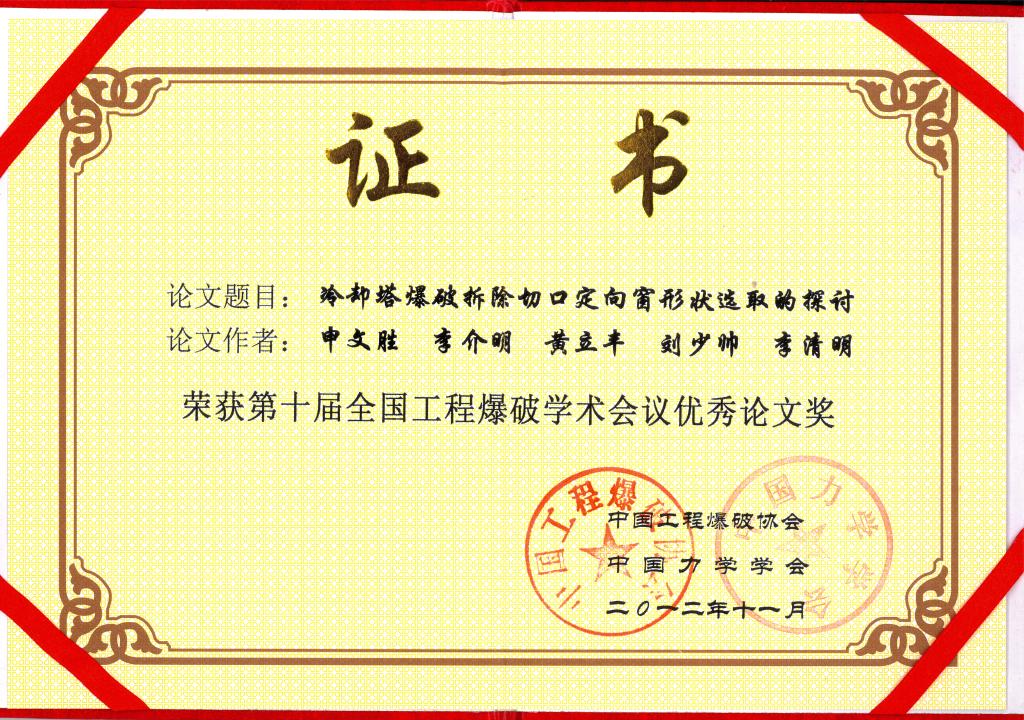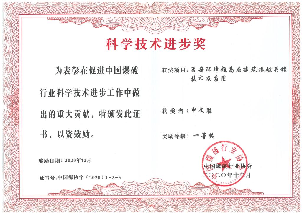 2020年,获得中国爆破工程协会“科技进步一等奖”