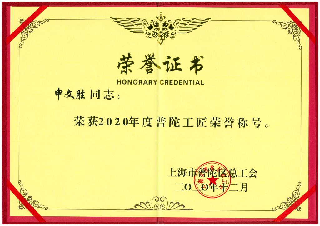 2020年,获得上海市“普陀工匠”荣誉称号