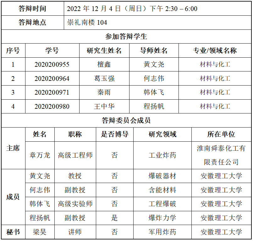 化学工程学院硕士研究生学位论文答辩公告(五)