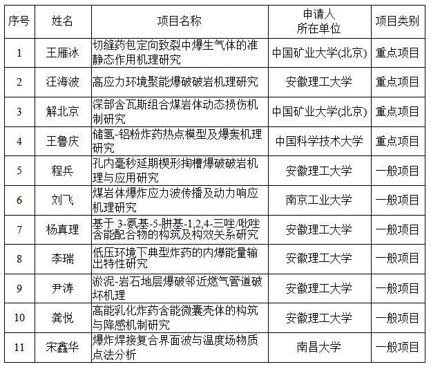 根据《安徽省爆破器材与技术工程实验室开放基金管理办法》规定,经个人申请、单位推荐、专家匿名评审和学术委员会审议,确定了2022年度的拟资助项目名单,现予以公示(见附表1)。